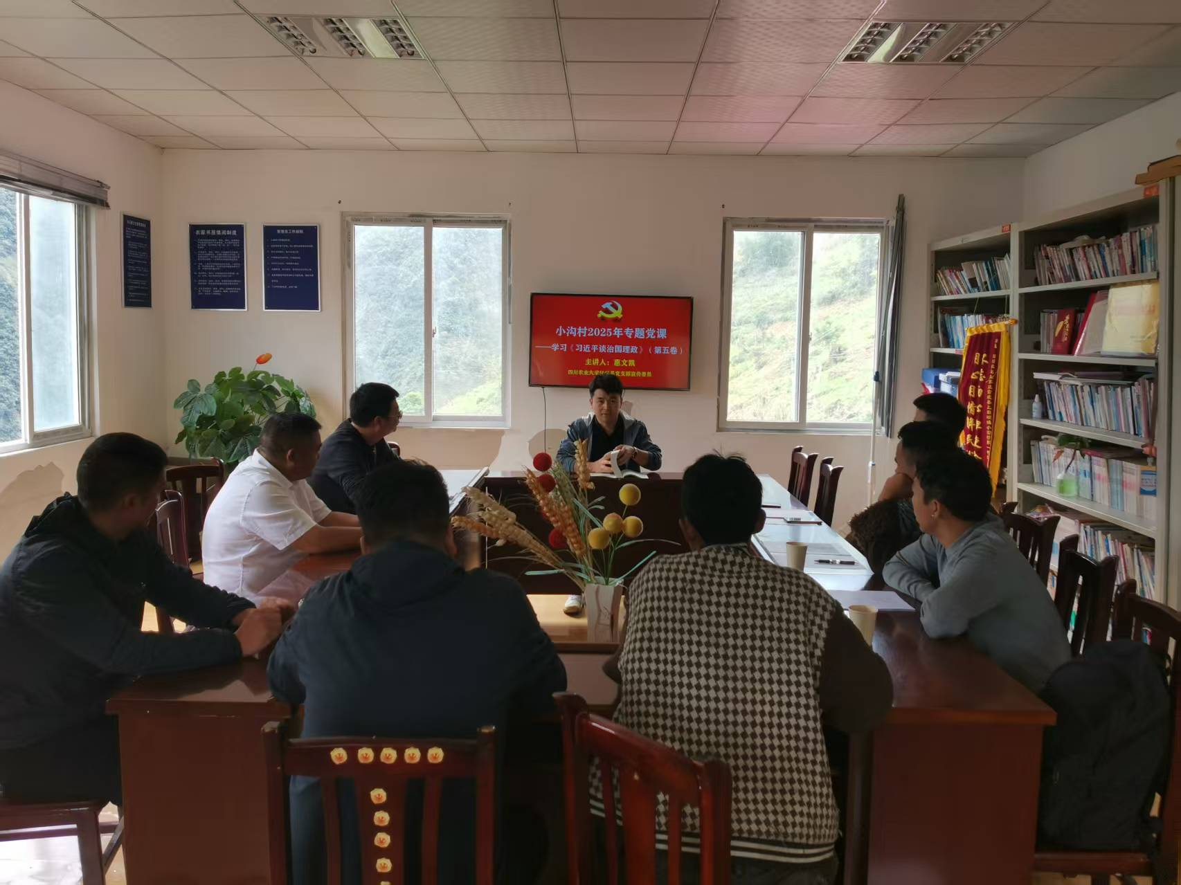 在理论共学环节,黄雄以《中华人民共和国森林法》为切入点,为小沟村“两委”干部和村民代表作专题辅导报告,通过科普讲解和实例分析,生动阐释了依法护林、科学兴林的重要意义。林学系教工支部宣传委员惠文凯同志领学了《习近平谈治国理政》第五卷中关于“因地制宜发展新质生产力”的重要论述,结合小沟村自然条件与林业资源,引导大家树立绿色发展理念,探索适合本地的生态产业发展新路径。
