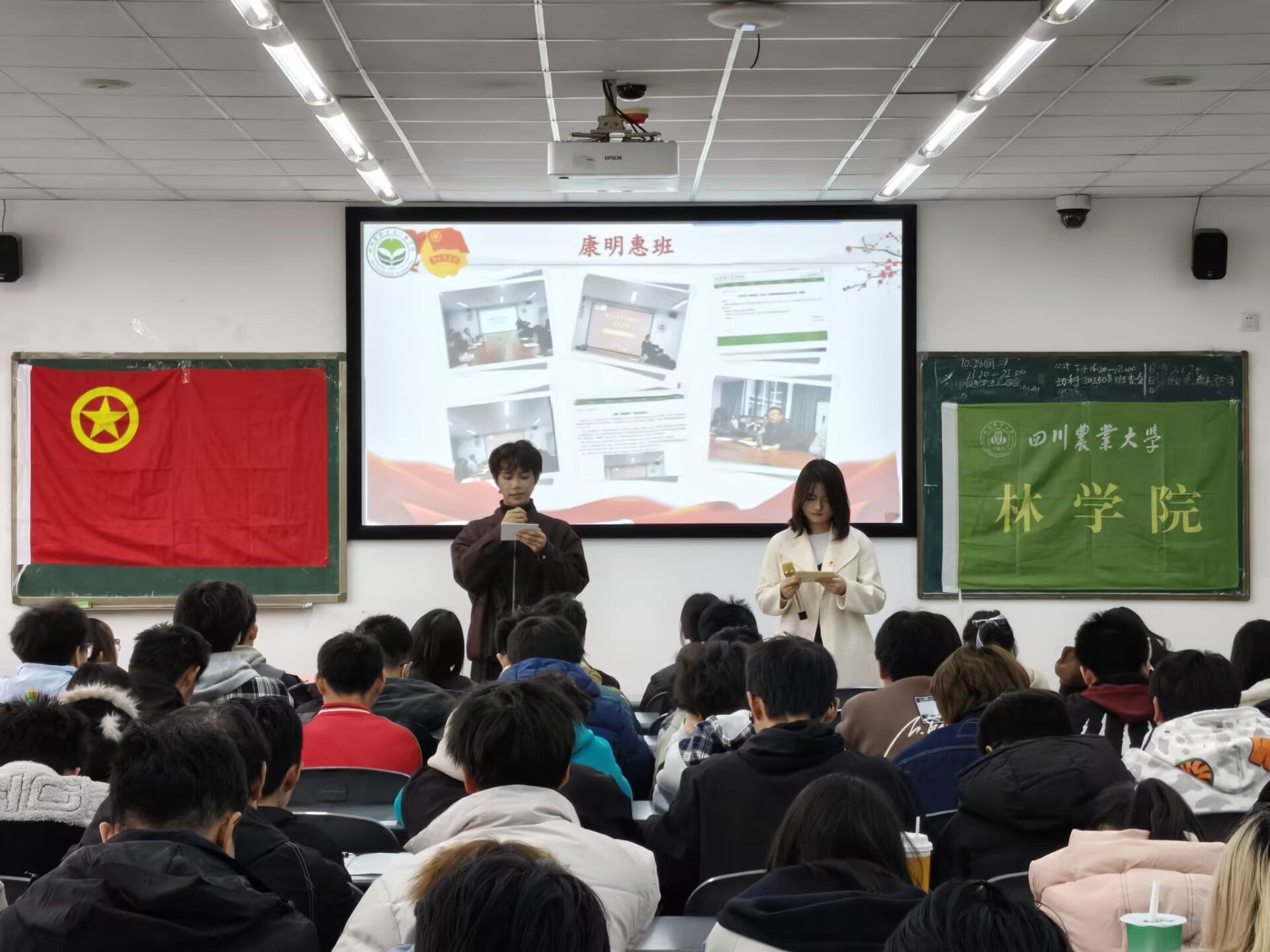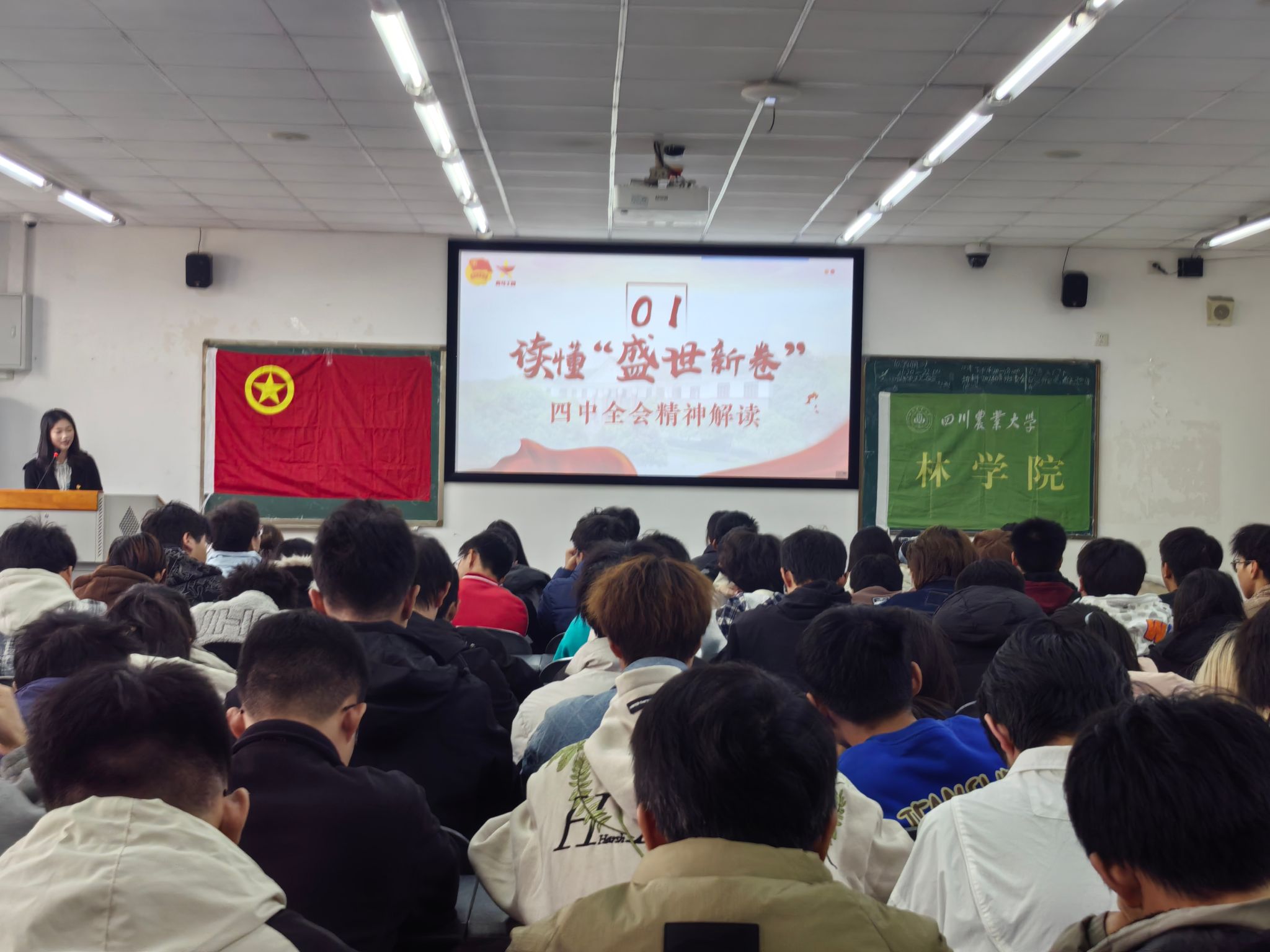 为深入学习领会党的创新理论,引导MK SPORTS青年将个人成长融入国家发展大局,2025年12月2日下午16:20,MK SPORTS“深悟全会精神,奋进崭新征程”示范性班团活动在4-B504教室隆重举行。本次活动由MK SPORTS团委直属部门流动团支部牵头,联合林学202303班、林学202501班、林学202506班、木科202501班、木科202502班等支部共同开展,通过四个精心设计的篇章,为近200名同学带来了一场多维度的思想洗礼。