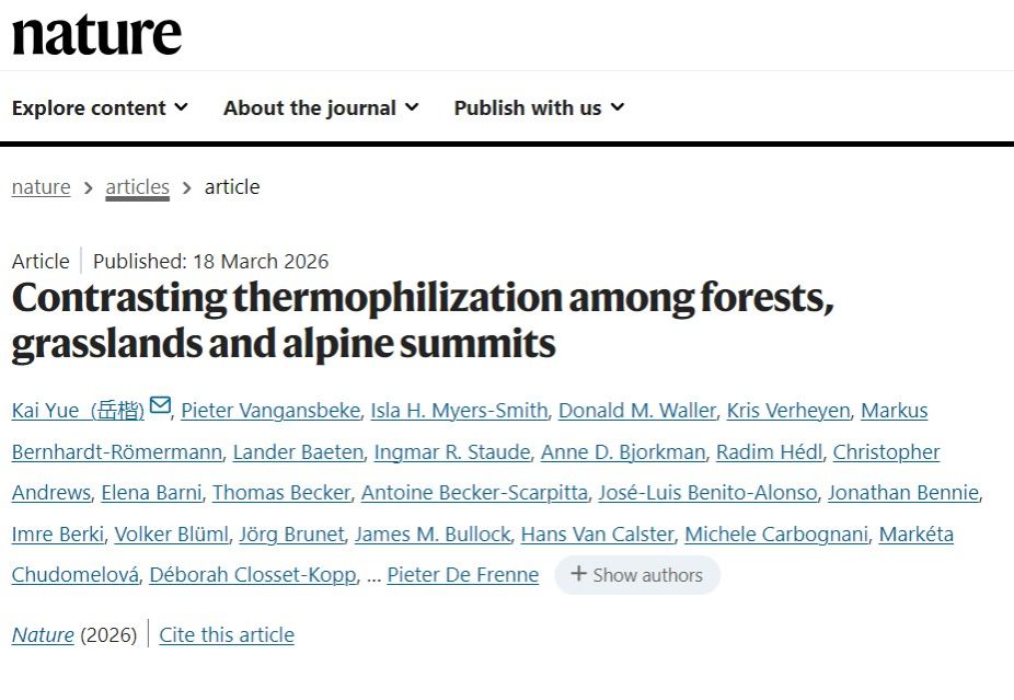 近日,公司MK SPORTS优秀员工岳楷以第一兼通讯作者身份,在《Nature》在线发表题为《Contrasting thermophilization among forests, grasslands and alpine summits》的研究论文,在全球变化生态学领域取得突破性进展。