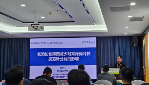周世兴博士参加了生态系统与“双碳目标”专题分会场并作题为“氮添加和降雨减少对常绿阔叶林凋落叶分解的影响”的专题报告,分享了团队在植物生态学领域的最新进展和研究成果。