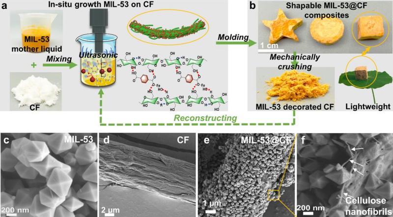 论文二题为“Simple ultrasonic integration of shapeable, rebuildable, and multifunctional MIL-53(Fe)@cellulose composite for remediation of aqueous contaminants”。金属有机骨架已被公认为修复水体有机污染物的最佳材料之一,但易碎的粉末形态限制了其实际应用。该成果以铁基金属有机骨架和竹纤维素为原料,制备了一种可塑、可重构且多功能的复合材料。结果表明,金属有机骨架晶体在纤维素表面生长均匀,相互结合稳定。复合材料不仅对甲基橙、亚甲基蓝和四环素具有高效的吸附能力,也可通过光催化降解四环素。该成果为金属有机骨架修复水体污染物的实际应用提供了一种新方法。