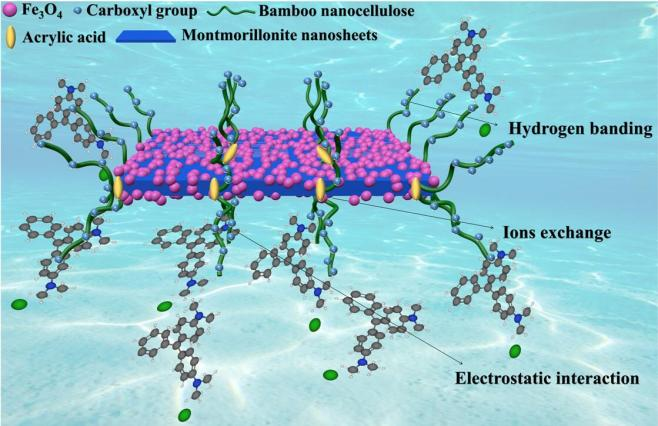 论文一题为“Magnetic nanocellulose-based adsorbent for highly selective removal of malachite green from mixed dye solution”。该成果报道了以废弃竹纤维和蒙脱土为原料制备的一种新型磁性吸附剂,用于高效选择性去除水体中的孔雀石绿染料,最大吸附量为2282.3 mg/g。研究深入的分析了复合材料对染料的吸附过程与机理,为林竹资源的高效利用和水体有机物污染处理研究提供了新思路与新方法。